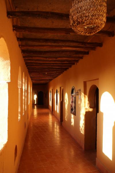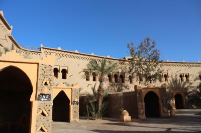 サハラ砂漠の入り口に佇むオーベルジュ。砂漠なのに庭にはプールもあり、ハマムも完備。客室は民族チックなファブリックで統一されていてカワイイです。インテリアもステキ!タオルは豊富にあるけどバスタブはありません。トイレは個室仕様。サハラの日の出を見るのには絶好のロケーション。夜は真っ暗なので外を歩く時は懐中電灯が必需品です。