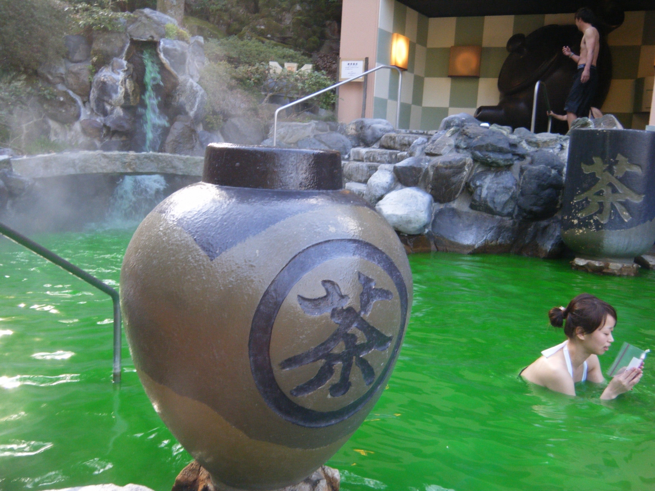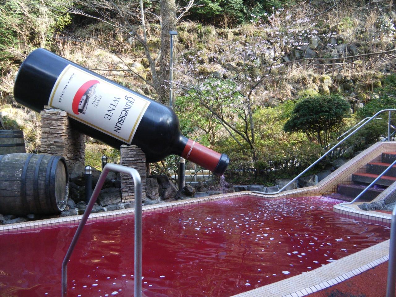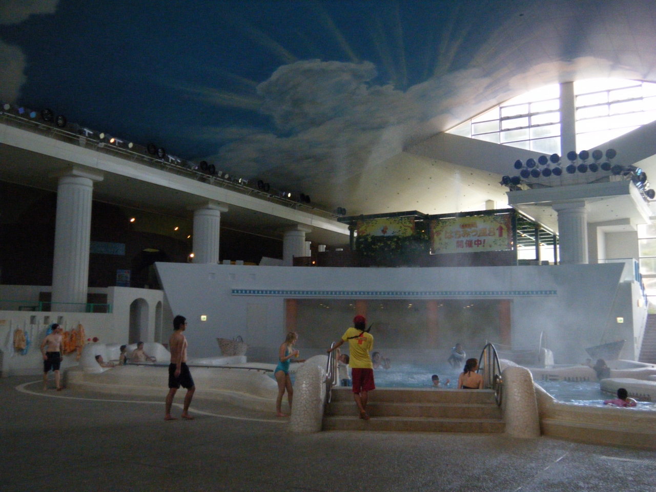 室内の広いプール、屋外にはワイン風呂、お茶風呂、酒風呂、などいろいろなお風呂があり、ひととおり、入りました。