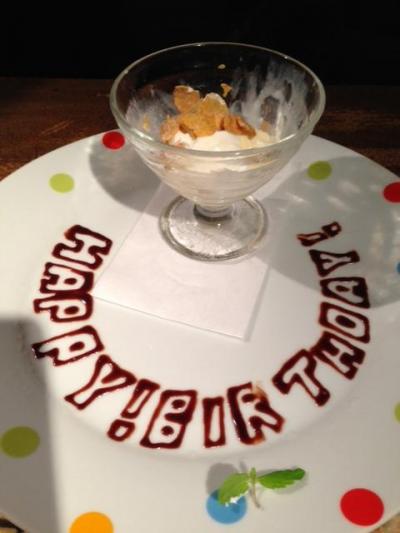 ひととおり食べたあと、ケーキをメッセージとキャンドル付きで出してくれました。おまけにふたりで(主人と)写真をとってくれてフレームにいれてプレゼントしていただきました。