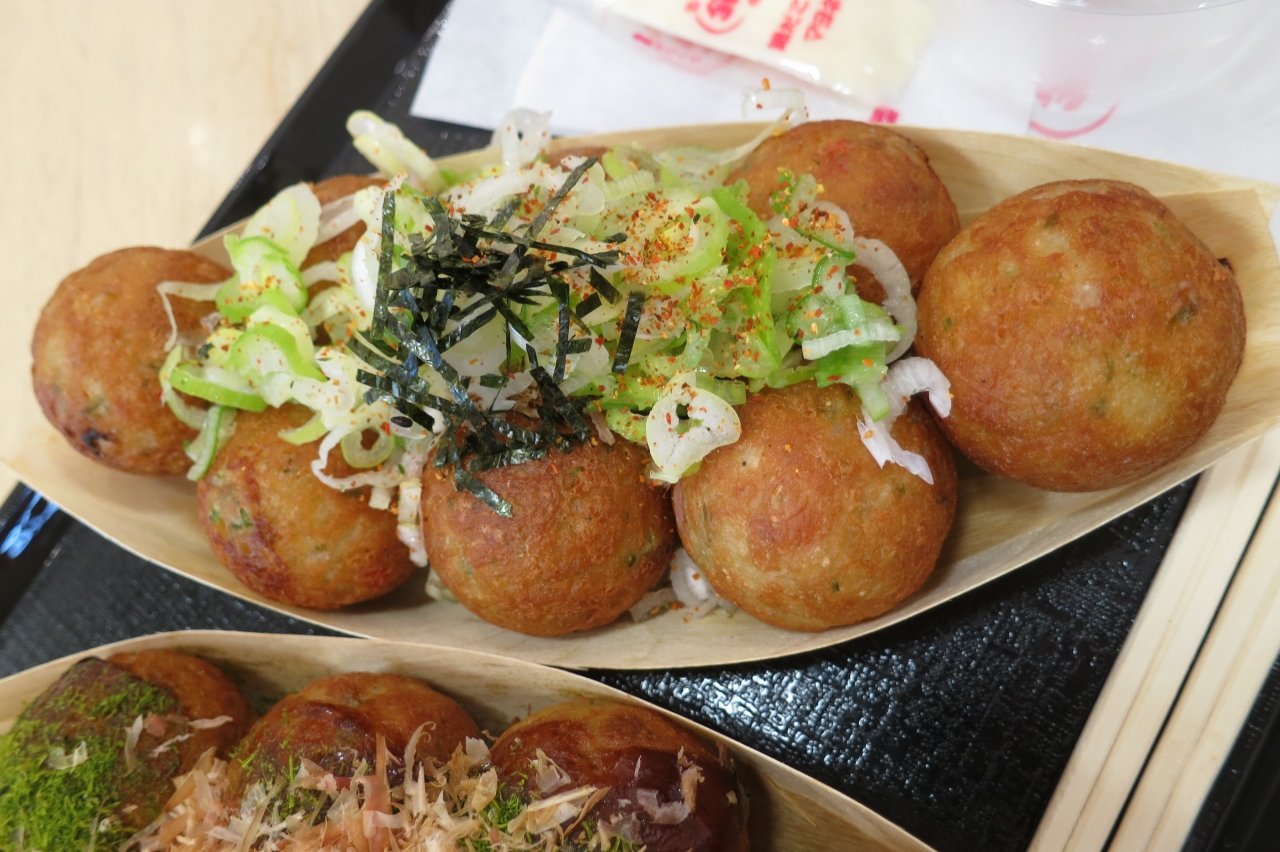 普通のたこ焼だけでなく、ネギがたくさん入っているものなど、いくつかの種類がありました。持ち帰りすることも、目の前で食べることもできます。