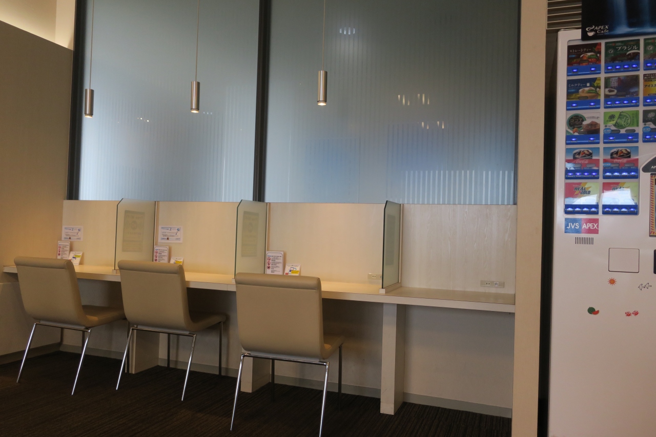もうひとつ、ANAFESTAもありますが、こちらのほうがお土産物もたくさん売っているし、飲食物のメニューも多いような気がします。飲食用の台もあります。