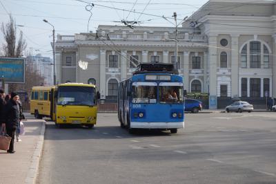 オデッサではトロリーバスがまだまだ現役で(といってずいぶん古い車体ですが),鉄道駅の前などはいくつかの系統のトロリーバスが発着しています.