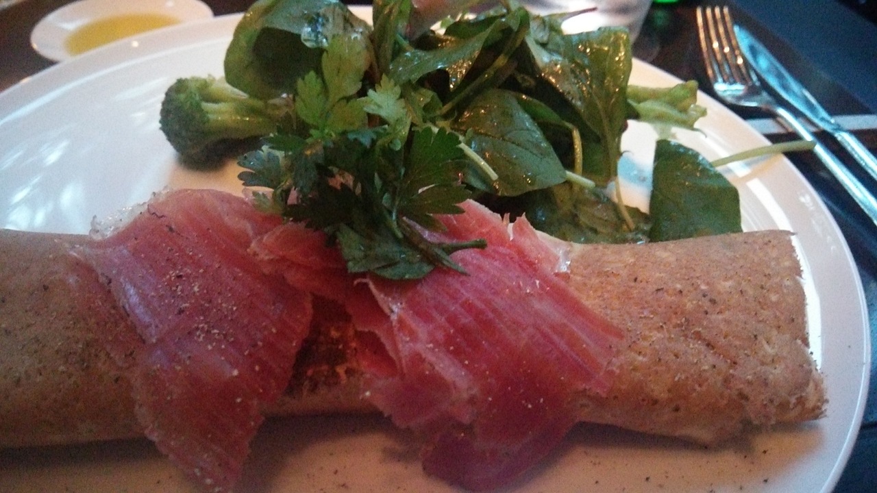 タルトフランベは、上に生ハムが載っていて、それぞれフランス産とスペイン産にしてくれました。生ハムは、カウンターの向こうで切ってるところが見えて、スペインバルにいるかのようでした。