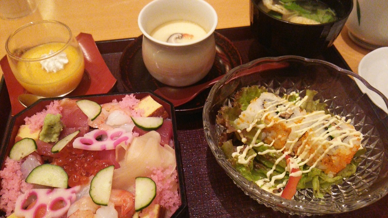 バラちらしにカルフォルニア巻き、茶碗蒸し、desert、お椀がついて1080円。