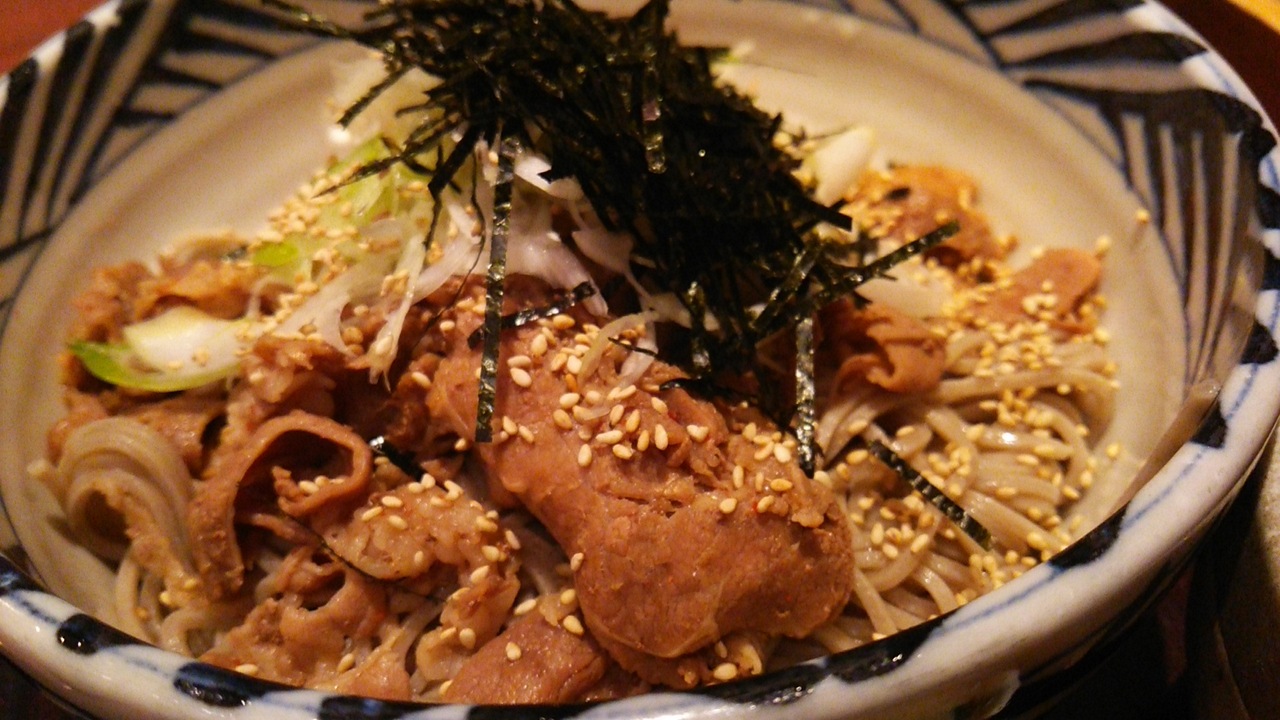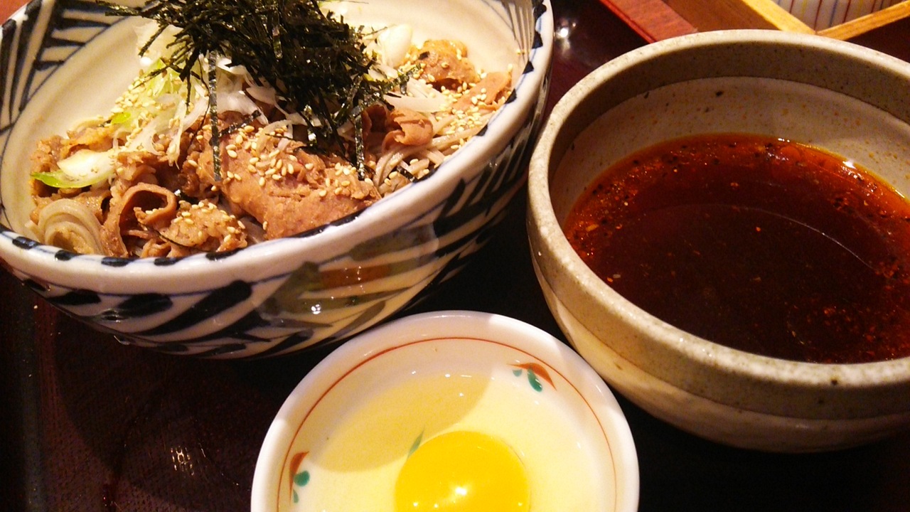 冷たいお蕎麦の上に牛肉がのってて、ピリ辛つけだれに溶き卵を入れて、つけながら食べます。
