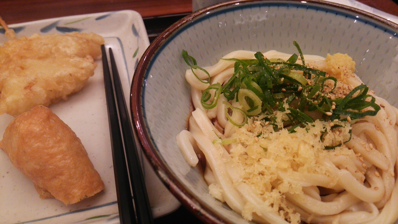 今日は、ぶっかけうどん、玉ねぎ天ぷら、ミニいなり。