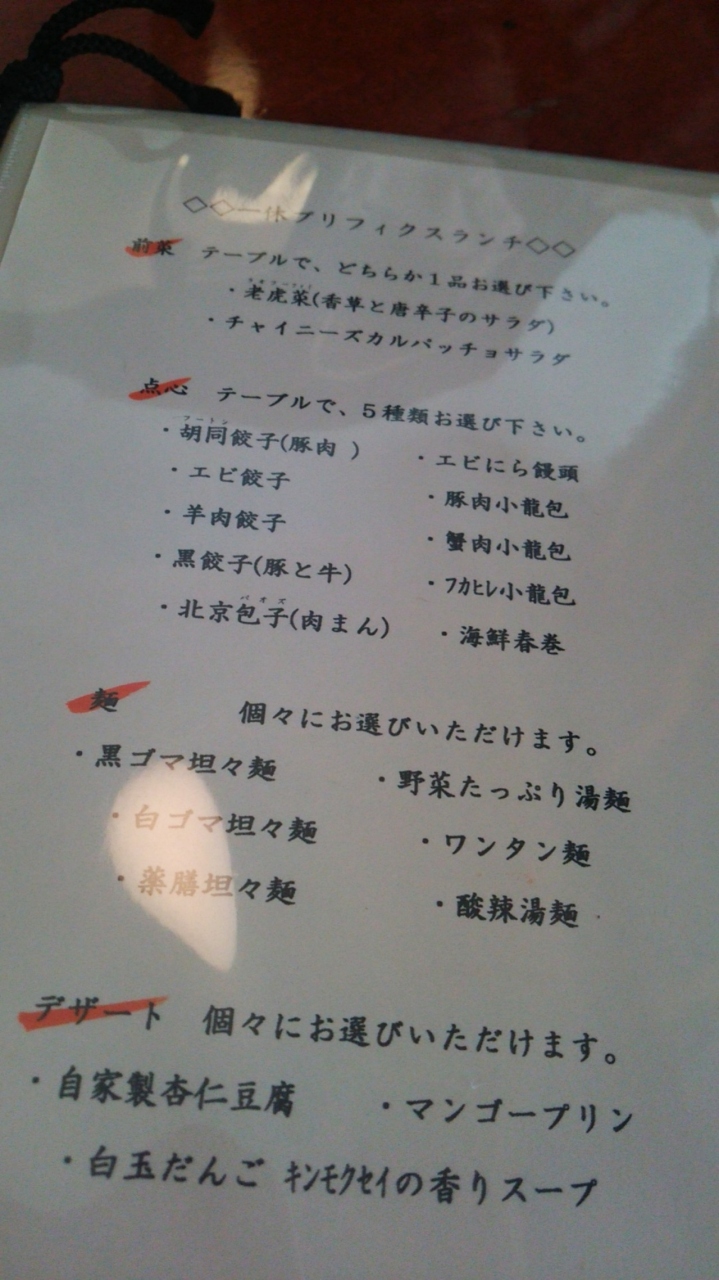 一休からの予約で、乾杯ドリンク、前菜、飲茶、麺、デザート、お茶つきで、1980円。