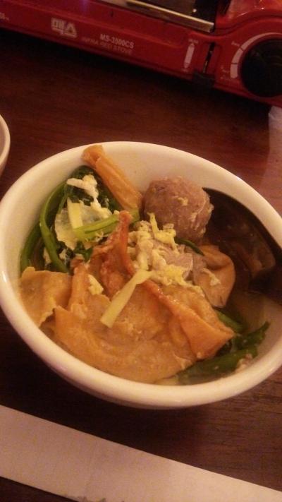 あっさりスープで、具材は、野菜、牛肉、乾燥湯葉、肉団子、きしめんです。