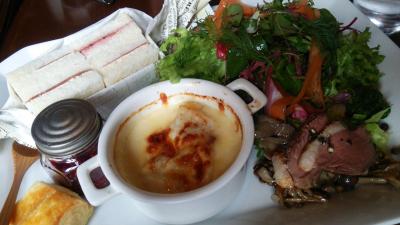 ワンプレートにグラタン、サラダ、サンドイッチ、ミニスコーン、ジャムが乗っていて、ドリンク付き。