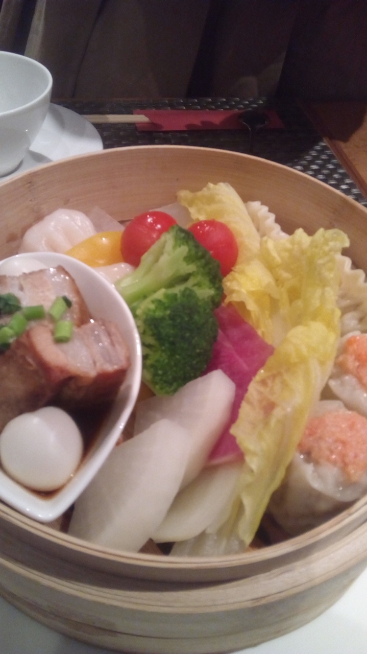 【1段目】シンガポール飲茶セット(海老餃子、カニ焼売、スティームドベジタブル、豚の角煮)&中華粥
