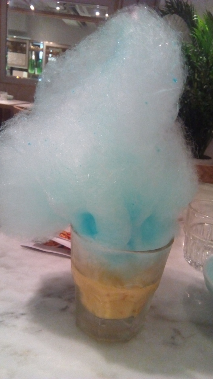 マンゴープリンに綿菓子が載った、変わったデザートで、見た目に惹かれて注文しました。