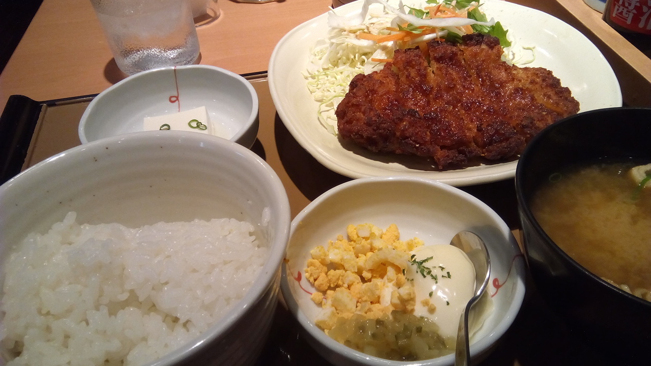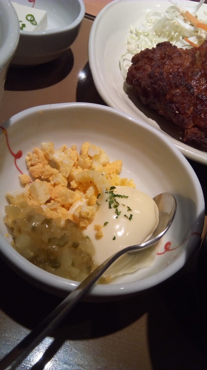チキン南蛮定食を注文。お味噌汁、サラダ、冷奴が付いて740円。お米も美味しくてご飯が進みます。それと驚いたのが、タルタルソースがマヨネーズ、卵、ピクルスがそれぞれで出てきて自分で混ぜるのです。