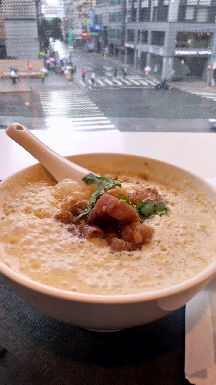 おぼろ豆腐に黒酢や干しエビ、パクチー、揚げパンが入ってて優しい味です。