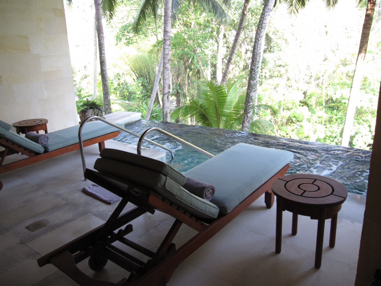 冒頭でも記したように、エントランスやホテル自体の造りは素晴らしい。清流沿いのプールも最高!また特筆すべきは、滞在中一番のお気に入りだったジムの中のジャグジー♪目の高さには森が広がり眼下には清流。そしてジャグジーのお湯加減がちょうどよくて、朝、晩と毎日2回は入るほど通いつめた。ジムの入り口に置いてあるジンジャーティーがこれまた美味!!至福の時よ~永遠に・・・という感じ。それからライブラリも併設されていて、ゆったりとした雰囲気の中、読書やインターネットなんかもできる。この空間は滞在中かなり重宝した。