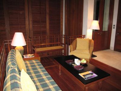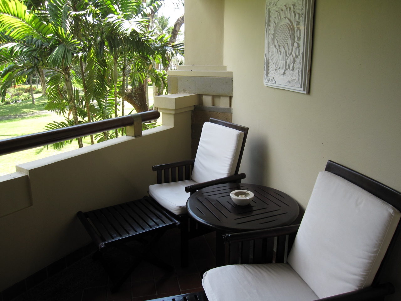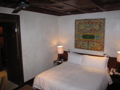 次に客室だが、落ち着いた配色のお部屋はゆったりな雰囲気で居心地抜群。自分の家もこんなアジアンスタイルにしたいわ~と思わせる決して派手さはないが、シンプルで飽きのこない空間だった。バルコニーにもソファーベッドみたいなものが置いてあり、くつろぐには十分なスペース。(だが日中は暑すぎて一度もバルコニーでゴロンはしなかった・・・。。)