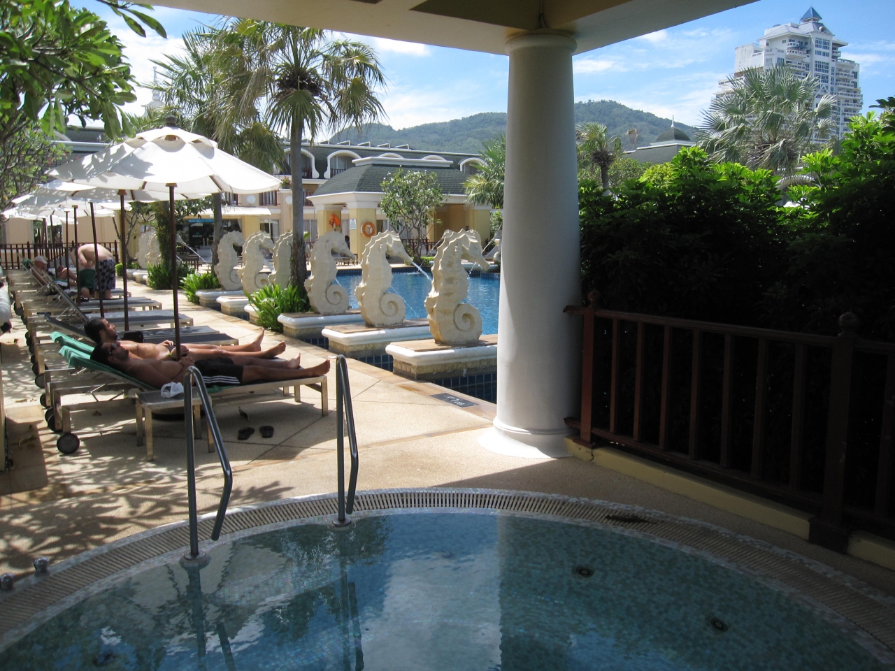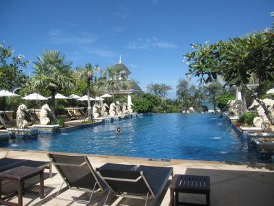 次にプールだが、これはかなり気持ちよかった。プールは1階と2階部分に1つずつあり、どちらからもパトンビーチと海が見え、凝った造りではないものの、気持ちよくプールに浸かれる。プールサイドのチェアも十分な数が用意されていて、雰囲気は非常に開放的で○。ただし、プールサイドにタオルが全く用意されておらず、各自の部屋からプール用のタオルを持参しないといけないのが×。これ、タオル忘れたら取りに戻るの相当面倒やん。