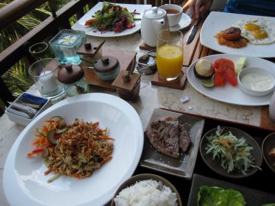 はっきり言って味と値段が釣り合わない。夕飯時にアユンテラスでナシゴレンを頂いたのだが、お皿一面黄色で見た目は街中の食事とあまり変わり映えしない。普通。お味は不味いわけではないが特徴無し。これ1皿でえぇ~!?という値段でしたので、物足りなさMAXな気持ち。ただ朝食は宿泊料金に含まれていたため、オーダー形式のビュッフェで毎朝おなかいっぱい食べた。フルーツジュースやスムージーは最高に美味しいが、お料理はこれも普通。ただ眺めの良い場所で気持ち良く頂けるのがGoodかな。