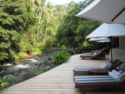 サービスは決して悪くはないが、一流という印象はあまり受けなかった。至って普通。良かったのはエントランスに無料ミネラルウォーターがあるので、出かける際に気軽に持参できること。あと就寝時のベッドメイクでベッドサイドに、心地よい睡眠を導いてくれる切り花なんかが置いてあって、細かい心遣いには癒された。ただ一点どうしても改善頂きたいのが、ウブド市内までの無料シャトルバス。このシャトルバスの時刻が非常に不便だった。確か最終の送迎が夕方頃に終わってしまうのだが、この時間帯って夕飯には早すぎるし、仮に早めに夕飯をウブドで食べたとしても、もうホテルに戻る足がないよ、という時間帯。これってホテル内で高~い夕飯を食べさせる戦略じゃないの?と疑わざるを得ない。でもここのホテル、レストランが充実していないし(夜は1軒だけ)、感動するほどお料理が美味しいわけでもなく、しかも何と言っても値段が高すぎる。ホテル周辺、徒歩圏内で行ける場所に観光客相手のお店なんてないし・・・。ということでこのシャトルバスの運行時間には改善の余地大いに有りだ!!