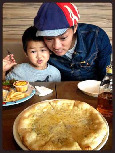 大人2名で ランチセットを頼んだ。 ¥3000 くらいだったかな? 初めのドリンク、食後のコーヒー、 サラダ、パスタ、ピザが選べる。 イカスミパスタ、 チーズのピザにした。 ワインは 初めのドリンクとして(ハンドルキーパー の主人の分) 2杯飲めた。。 ラッキーー☆ ほんと 美味しかったけど、ちょうど昼時だし結構並んだ。