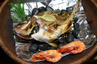 半身は刺身 半身は大きな陶器の皿で蒸し焼き