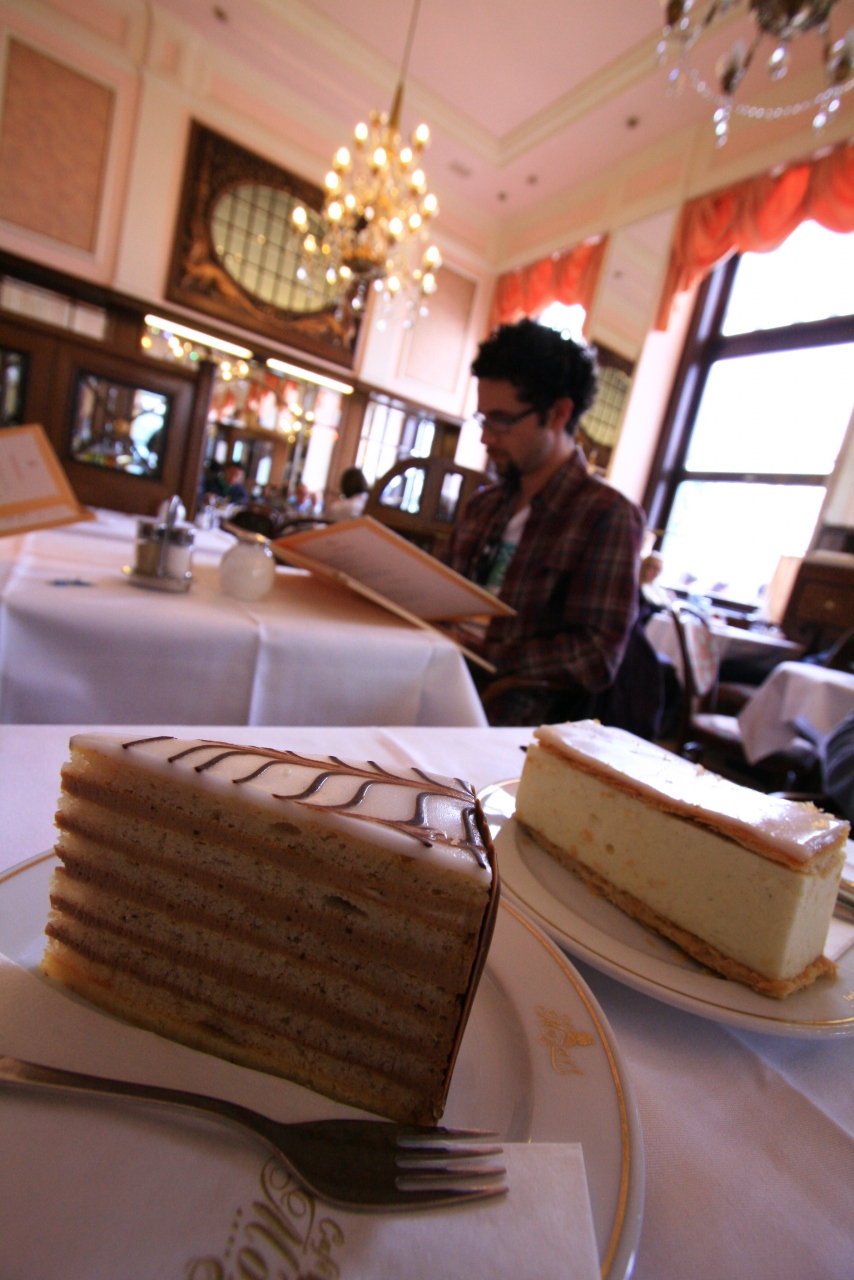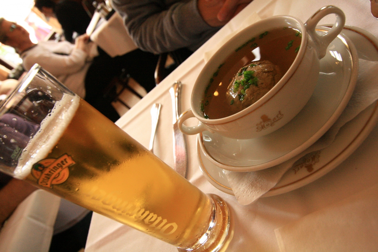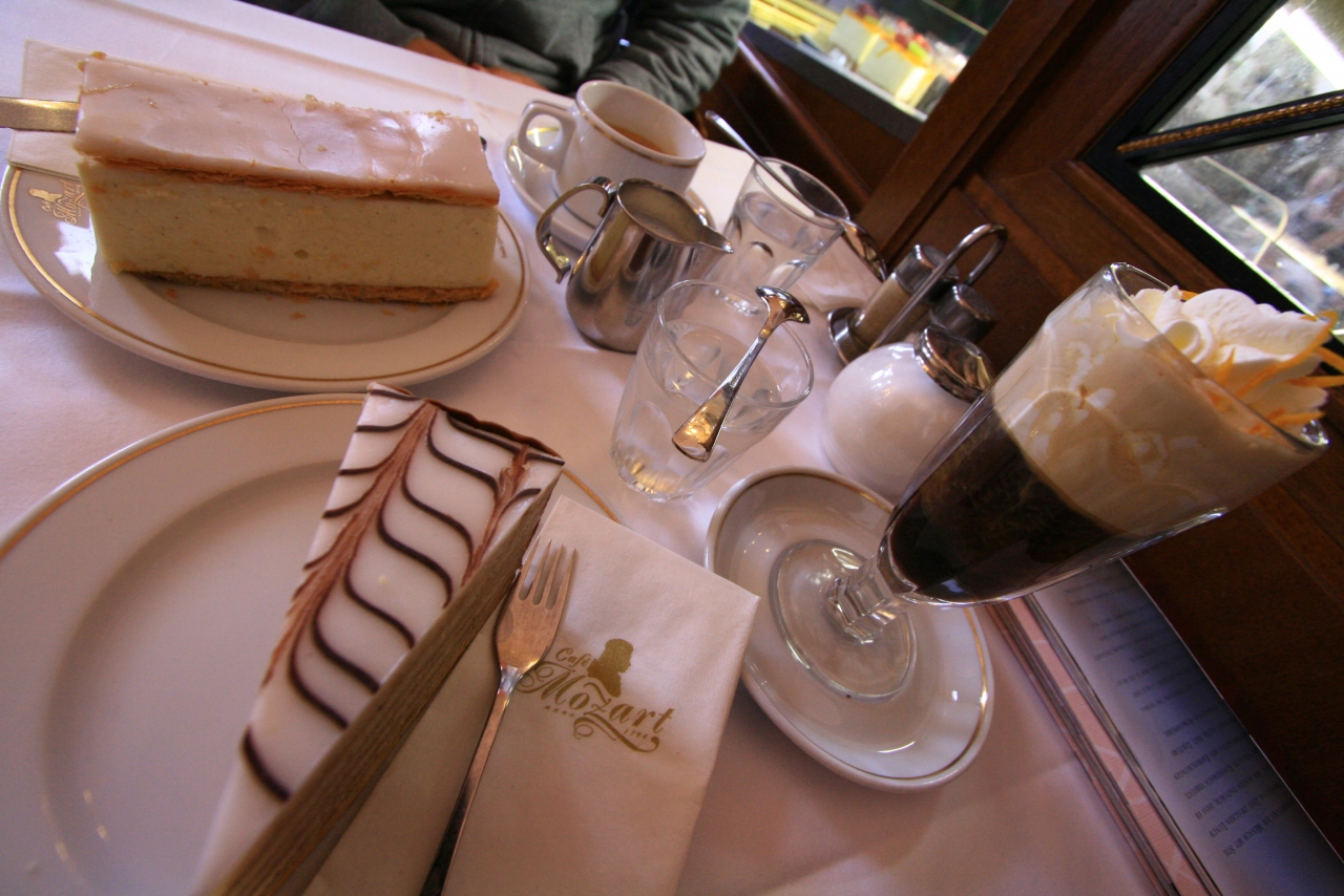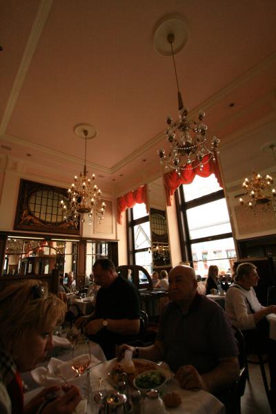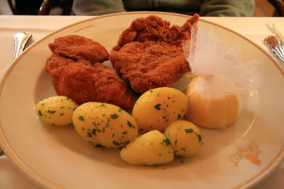 14時頃の遅いランチとお茶を、と思って行ったら結構並んでいました。相当忙しそうでしたがテキパキと座らせオーダーを取り(日本語メニュー有り)、適度な愛想笑いも浮かべて接客してくれました、まさにプロッフェショナル!Backhuhn鶏唐揚げ16.9ユーロ、Leberknodel牛レバーの肉団子入りスープ5.3ユーロ、Tolte(EsterhazyschnitteとCremeschnitte)各4.7ユーロ、Groser Moccaモカ2,5倍4.7ユーロ、MariaTheresia オレンジリキュール入りモカ 7ユーロ、水5.3ユーロ、ビール3.5ユーロ(水より安い!)で合計50.3ユーロ!!今回の旅行で一番高い食事になってしまいましたが、優雅な時間を素敵なお店で過ごせたのでよかったです。
