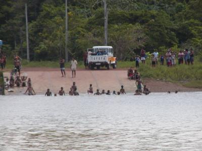 マラジョー島のピラニアやワニがいそう(というか確実にいる)川で泳ぐ地元...