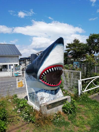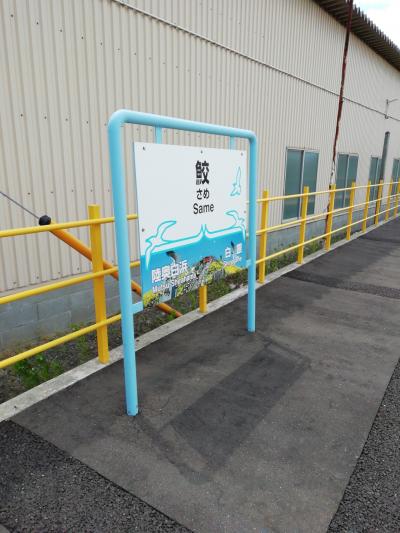 鮫駅に戻りました。駅前にある駅名である鮫のオブジェ。やっぱり撮りますよ...
