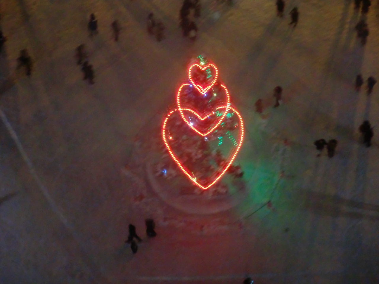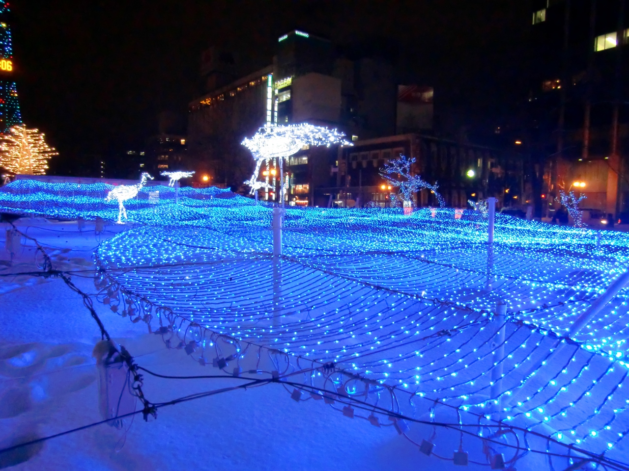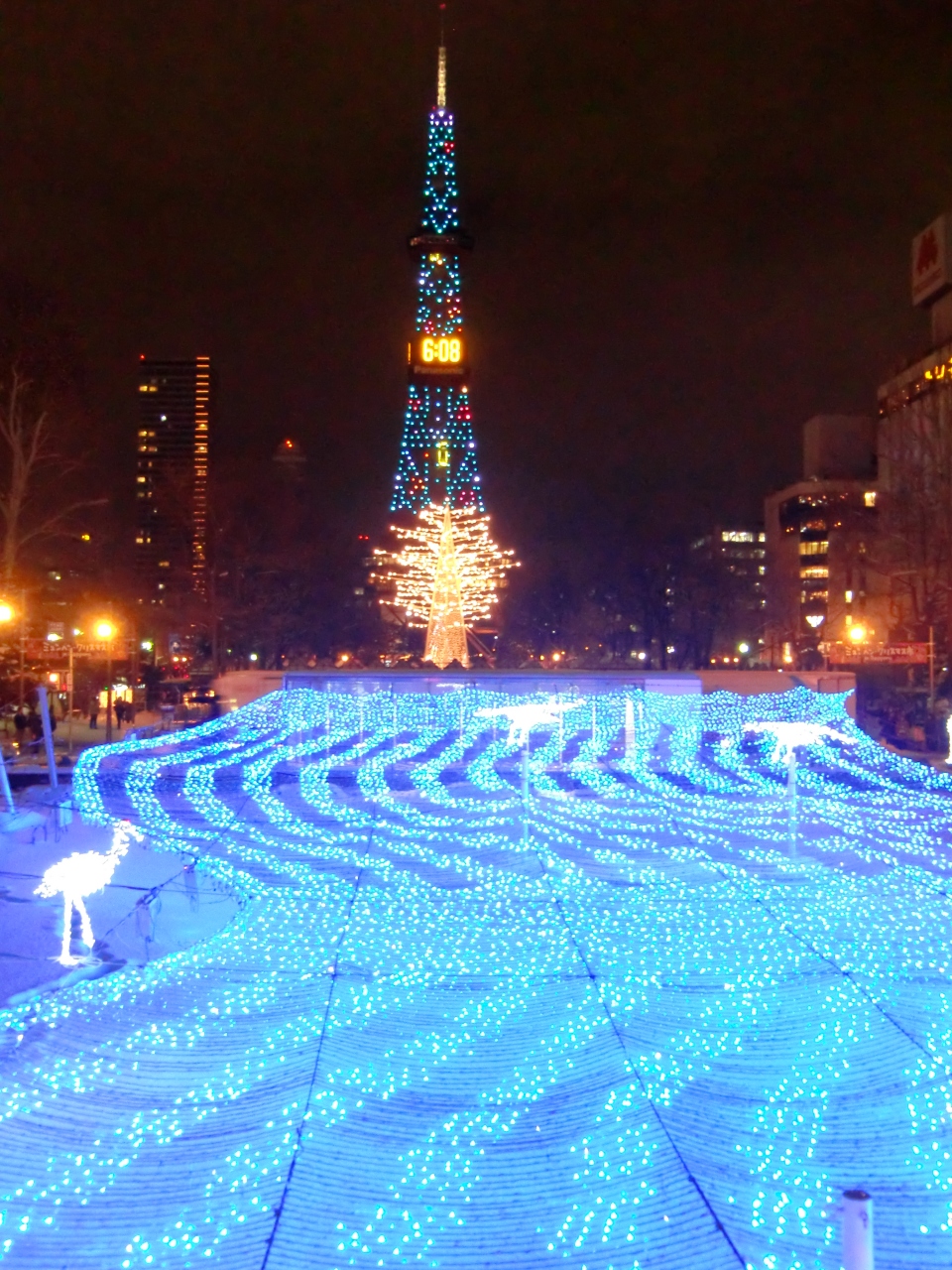 ホワイトイルミネーションの最終日に訪問。今年は地下道の工事とかで、例年より規模が小さいとの事でした。そのかわりと言っては何ですが、最終日にもかかわらず、比較的観光客は少なかったです。中国からの観光客が多かったです。数年前に来た時には、テレビ塔からイルミネーションを観ようとするとかなりの待ち時間でしたが、この日はほとんど待ち時間なしでテレビ塔に昇る事ができました。テレビ塔から観る夜景とイルミネーションは本州では見る事ができない素晴らしい景色で来たかいがありました。特に雪が素晴らしい。住んでいる人にとってはやっかいでしょうが・・・。イルミネーションは流行のブルーの点滅が大変綺麗でした。陸橋のようなところから見る事ができるのですが、そこはかなりの行列ができていました。それと、テレビ塔の前のツリーが上から見るとハート型になっており感動しました。下から見ていると気づきませんでした。
