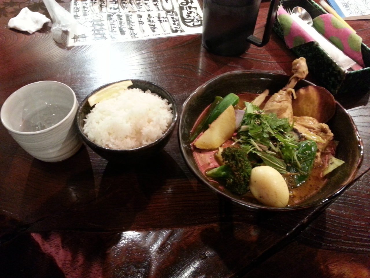 札幌観光の際に平日の昼前に行きましたが大行列でした。ホクレンビルの地下一階ということでサラリーマン、OL、観光客で大混雑です。となりが、味噌ラーメンの有名店なのでこちらも大行列。さて、1時間弱かかって入店。カウンター席とテーブル席、あと小上がりのような席もあります。座ったのはテーブル席でしたが、調理の様子が見れて楽しかったです。注文はやわらかレッグチキン、エビのおくおくスープ、オクラトッピング、白米の中、辛さはよく覚えていないですが、市販の辛口ぐらいを注文。お寺の名前がついていたのを覚えています。玄米も人気のようです。味の方はエビスープはさっぱりしていておいしいですが、本店に比べると旨みが少ないような気がします。普通においしいのですが、これだ!というところまで行かないです。チキンレッグも確かに柔らかいのですが味が無いように感じます。押し寄せる客への対応のためにこうなった?のでしょうか。野菜はたっぷりはいっていてグッドです。特にキャベツは大量に入っていて甘くておいしい。次回はやっぱり本店にしよーかなー。