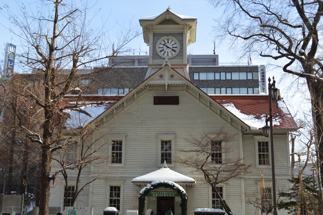 札幌市の北1条西2丁目にあるので、札幌駅から地下歩行空間を通って大通方面に歩いて行きました。適当なところで地上に出て時計台に到着。平日の午前10時過ぎだったので観光客もほとんどいません。観光バスのルートになっているはずですが。写真を数枚撮ってすぐにその場を離れました。建物には雪が積もってきれいでした。赤い星2つがアクセントになっています。ここは一応は重要文化財で札幌市の象徴的建物で、現在は1階が展示室、2階が貸ホールとなっています。時間があれば展示室をのぞくのもいいでしょう。噂では日本3大がっかり名所の1つと言われているようです。向かって右前方に写真スポットがあって記念写真を撮るのにいいです。
