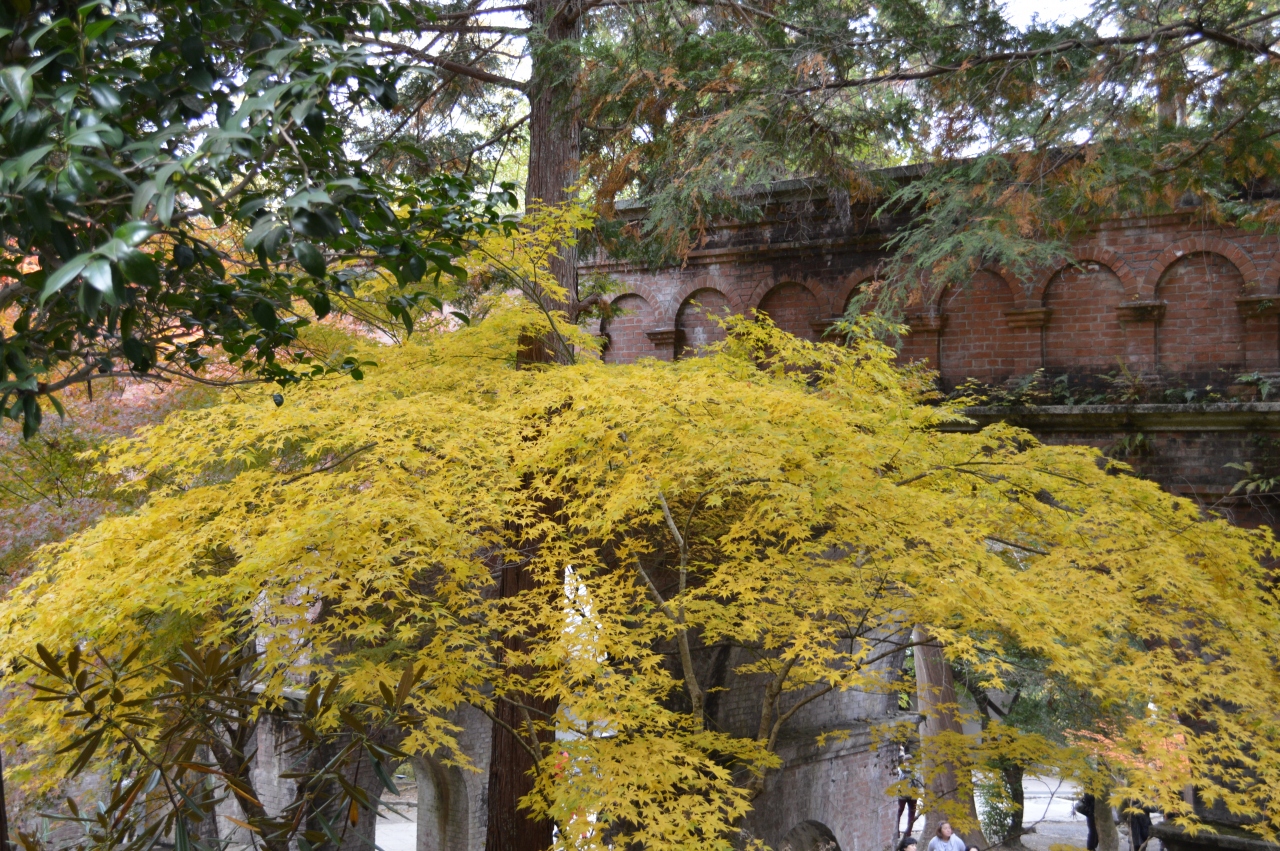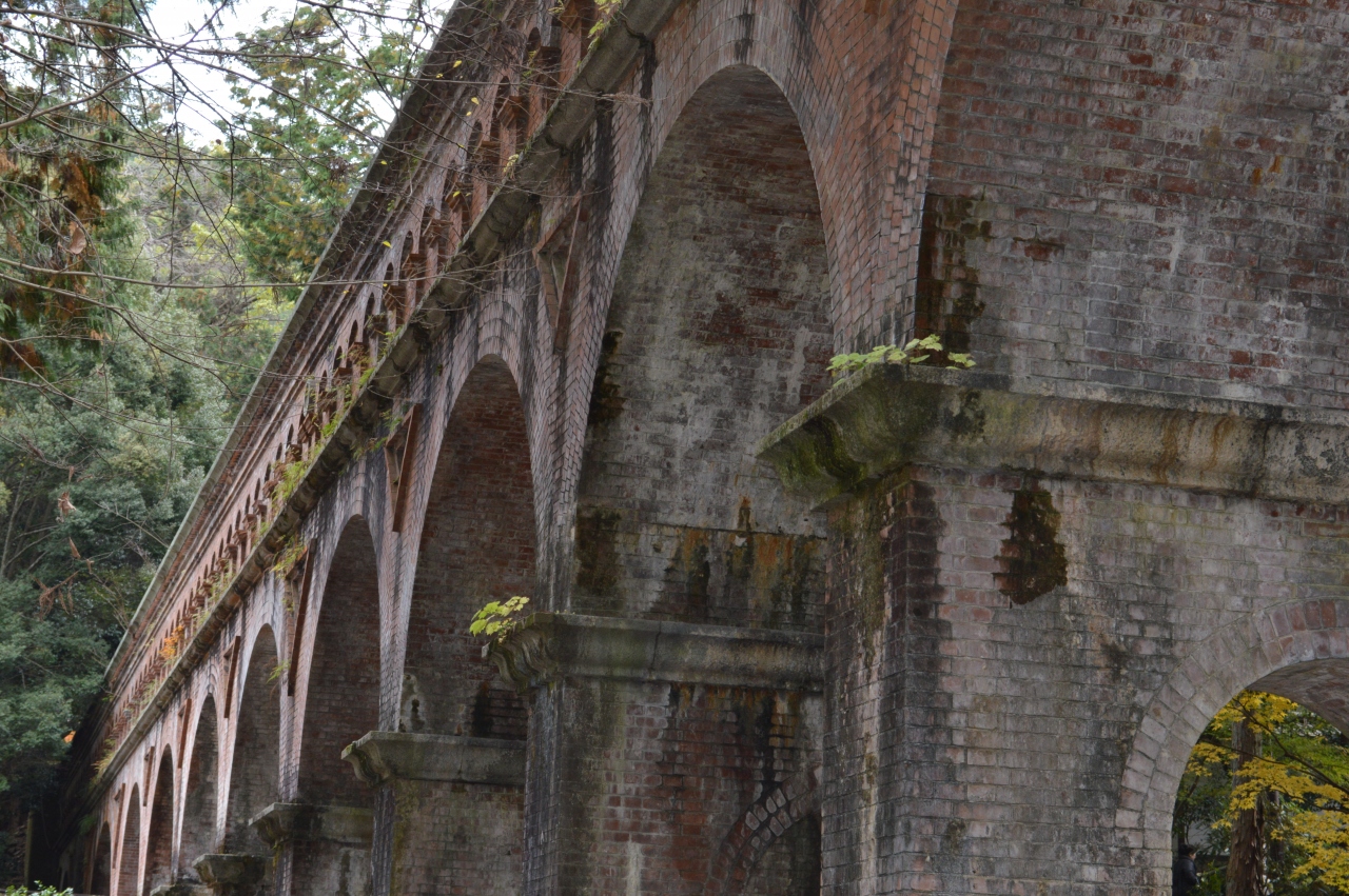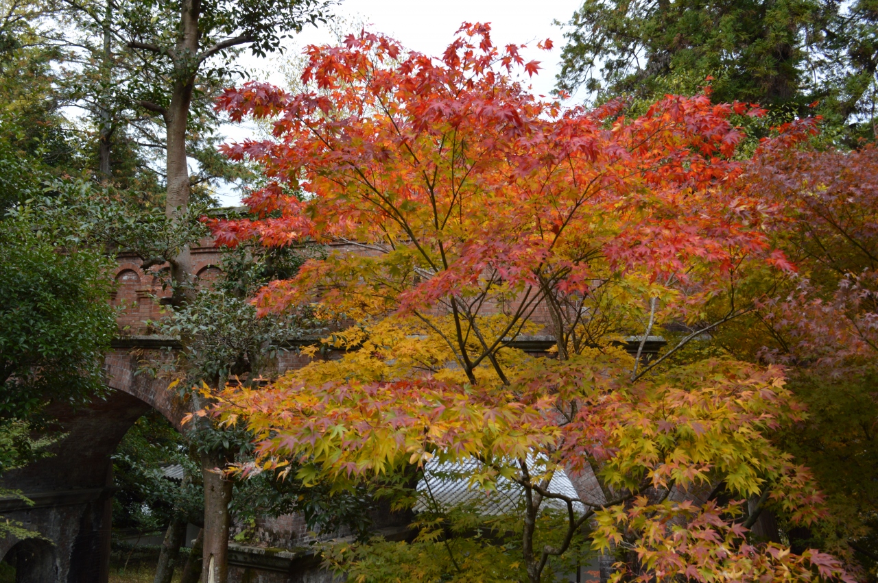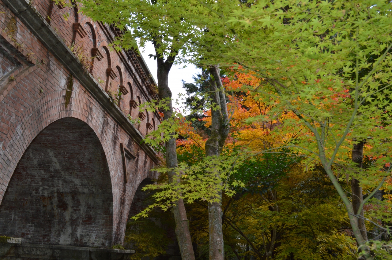 11月22日に京阪三条から東西線に乗って蹴上駅で下車、ぶらぶらと徒歩10分ほど歩いて南禅寺に到着。ねじりまんぽと呼ばれている隧道を抜けるて行くのが境内への近道です。さて、南禅寺は方丈庭園、三門、南禅院などが有名ですが忘れてはいけないのはこの水路閣です。琵琶湖疎水の分線にある水路橋で南禅寺の境内を通っており、アーチ型橋脚の重厚な建造物です。京都市指定の史跡にもなっています。この日は紅葉も見事で、橋と紅葉のコントラストは見ごたえがあり、多くの観光客で賑わっていました。私も珍しい建造物のため、何枚も写真を撮りました。1888年完成というのもびっくりです。100年以上も前ですが見事な花崗岩です。
