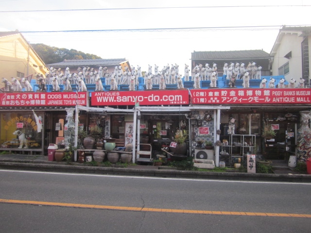 ただここは、屋根の上に沢山の犬の置物が並ぶ光景がインパクトあって、話の種だけの目的で訪問するのも面白い施設だと思います。因みにこの施設は、倉敷山陽堂アンティークモールとして、正確には貯金箱博物館の他に、倉敷DOG博物館、倉敷おもちゃ博物館の3つから成っていて、入場料300円で全部に入ることが出来ます。ただ、博物館としては、何やらいろんなものがごちゃごちゃ並んでいるだけで、整理しきれていないかな、という印象を受けました。- 旅行時期