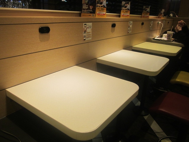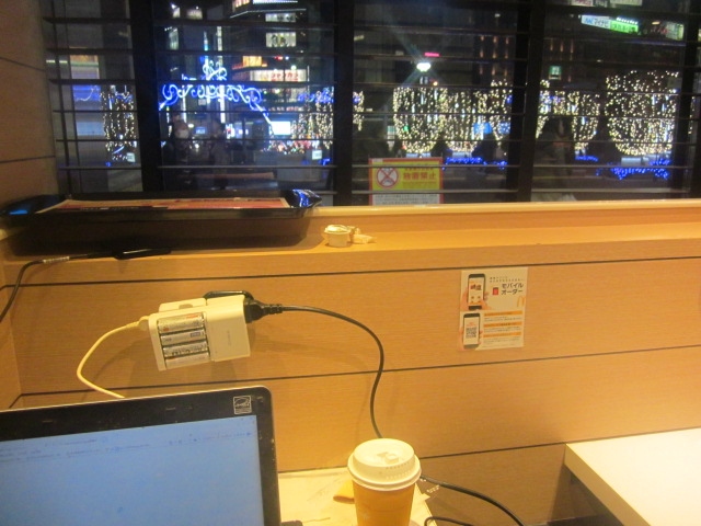 今回は、倉敷のアリオ内マクドで充電できなかった分を取り戻すため、再度、調査のためにこの店舗を利用しました。駅直結の店舗ということもあって、混雑は凄いですが、それにも増して、やはりビジネス需要の多さを考慮してか、お一人様向けの客席が多く、それぞれに電源が用意されているので、PCやスマホユーザーの方にとっては、とても使い勝手が良い店舗だと思います。また、場所によっては冬の夜はイルミネーションが客席から直接楽しめる、というのも、この店の利点の一つといえるでしょう。
