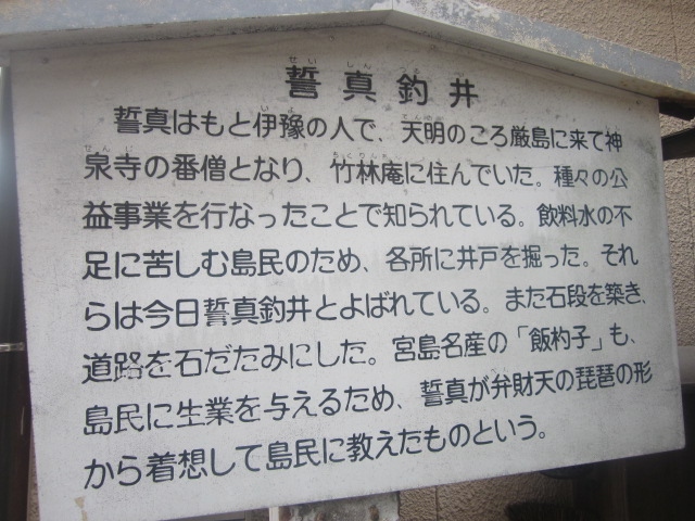 宮島散策においては、必ず見かける名前の一つが、こちらの誓真という名前の僧です。色々な公共事業に携わりながら、現在の宮島の社会基盤を築いていった誓真ですが、中でも慢性的な水不足に悩まされていた宮島の島民達のために、島内の各所に井戸を整備していったことは、現在でも島民の方々の尊敬を集めていて、今では使われていない井戸もありますが、現役の井戸もあったりして、大切にされていることがよく解ります。