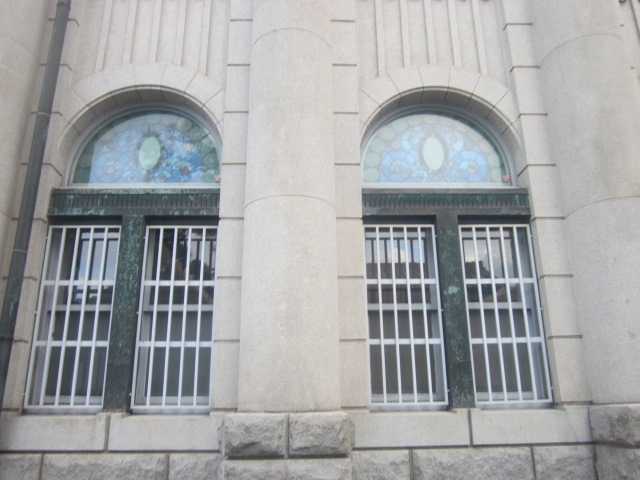 外窓の半円形のステンドグラス等、洋風銀行建築らしいお洒落なデザインも印象に残る建物でしたが、現在は大原美術館に寄贈されたそうで、今後の整備状況が気になるところですが、銀行建築としての品位を失わないような素敵な使われ方がされるといいなと思いました。(2019年12月現在、内部は非公開の状態でした。)- 旅行時期