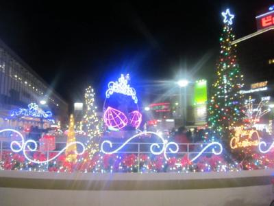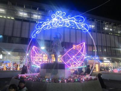 岡山駅前にて冬の夜を彩るイルミネーションです。今回はたまたま見かけたのですが、岡山駅といえば、やっぱりあの桃太郎像が気になるところですが、それを挟んで、桃から生まれたようなデザインになっているのが可愛らしかったです。他にも、ツリーや汗をかいているチューリップ(表現力が乏しくてすみません…)みたいな電飾が並んでいたり、と、規模はそれほど大きくもないですが、なかなか少数精鋭のステキなイルミネーションだなと感じました。
