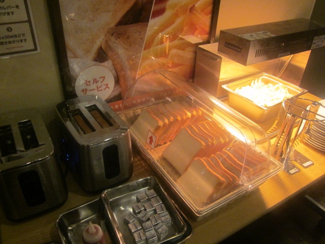 このチェーンネットカフェでは、名物の無料朝食が以前からありましたが、最近は食べ放題制に変わり、より沢山食べたい方には更にお勧めですが、以前はあったスイートコーン炒めのメニューがありませんでした(少なくともこの店舗に関しては)。また、食べ放題は食パンとフライドポテトですが、食パンに関しては、トースターの数に限りがあり、特にサービス開始時刻の午前6時頃には、”トースター待ち”の行列が出来ることもありますので、時間に余裕を持って入店時に無料朝食時間帯を30分以上確保して、等の考慮も必要かなと思います。(まあ、時間がない方は焼くのを諦めて、そのまま食べれば良いことですが…。)尚、食パンのコンフィチュールとしては、ジャム類はなく、マーガリンだけの用意でした。このチェーン店では、最近、外出も食品持込の自由も謳うようになりましたので、物足りない方は事前にジャム類や間に挟むハムやポテトサラダなどを用意したり、途中で外出して買いに行ったりするのも良いかもしれませんね。