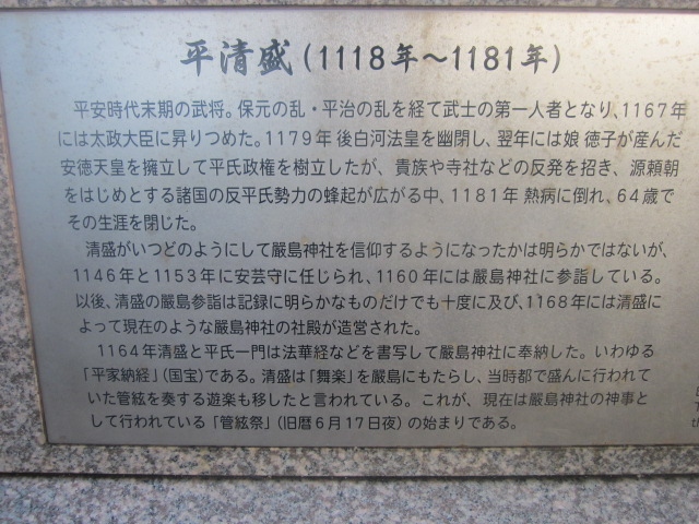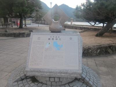 宮島桟橋前広場の桟橋の建物向かって左手には、三基の意義深い碑や像が並んでいます。歴史的な宮島の第一ヒーローとしての平清盛像、日本の観光地の代表としての貫禄を示す日本三景碑、と並んで、グローバルな宮島の現代の姿を象徴しているのが、世界遺産としての宮島を物語るこちらの碑です。