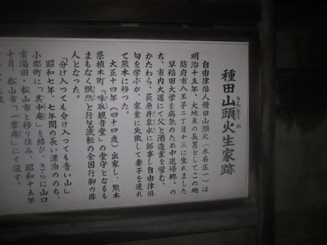 今回は防府観光の最後に、山頭火の小径を設定とは逆方向に歩いて、最後に到着したのがこちらでした。生家跡、の呼称が示す通り、現在では生家としての遺構が残されている訳ではないので、史跡巡りのテイストで訪問されると、ちょっと期待外れかなと思います。