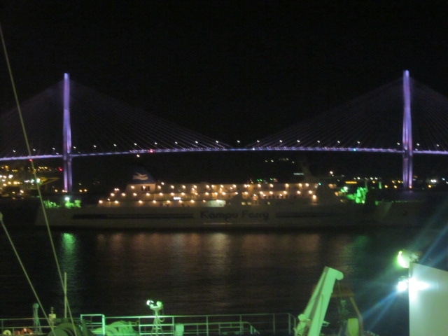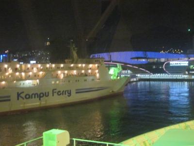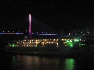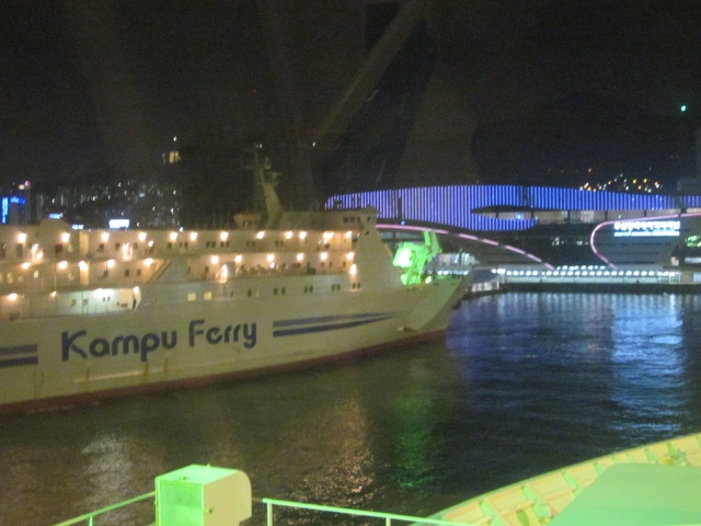 現行スケジュールでは、釜山港発時刻は、関釜フェリーの方が早く(21時)、22時半出航のカメリアラインに乗船していると、丁度、このフェリーの出航シーンを、自船に乗ってしまうと見られないアングルで楽しむことが出来て大感動でした。