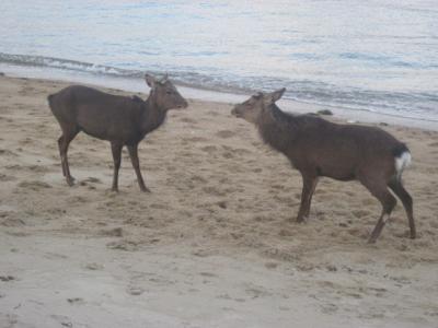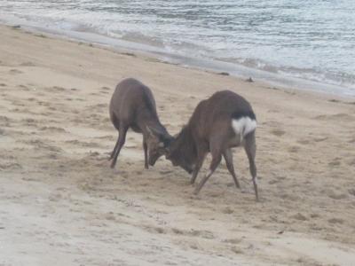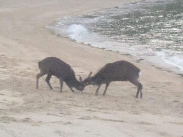 そして浜の方に目をやると、何やら面白い光景が…。砂浜で二匹の鹿が頭を寄せ合って、何やら対決している風情です。暫く様子を見ていましたが、本気で戦っている、という感じではなく、寧ろじゃれあっている感じで、最後は二匹が寄り添って海辺を歩く光景に、凄くホッコリと気持ちになりました。