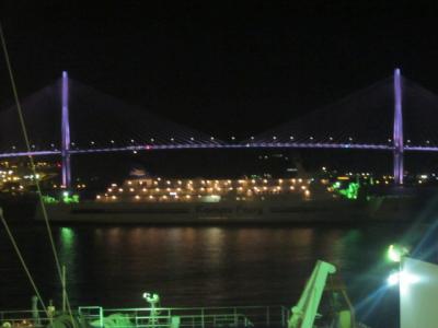 そして、カメリアから程よく離れた距離、釜山港大橋が近づく辺りで徐々に横向きとなっていき、一旦、釜山港大橋と平行に真横に並ぶアングルが楽しめ、この時が、橋と船とのコラボ風景を撮るのに最高のタイミングです。夜間はライトアップされる釜山港大橋をバックに眺める関釜フェリーの姿はなかなか迫力がありますが、基本的にこの光景は、カメリアラインの船上からしか綺麗に望むことが出来ませんので、是非、カメリアラインの釜山→博多に乗船機会がある方は、先に出航する関釜フェリーの動向にもご注目下さい。