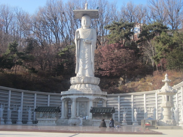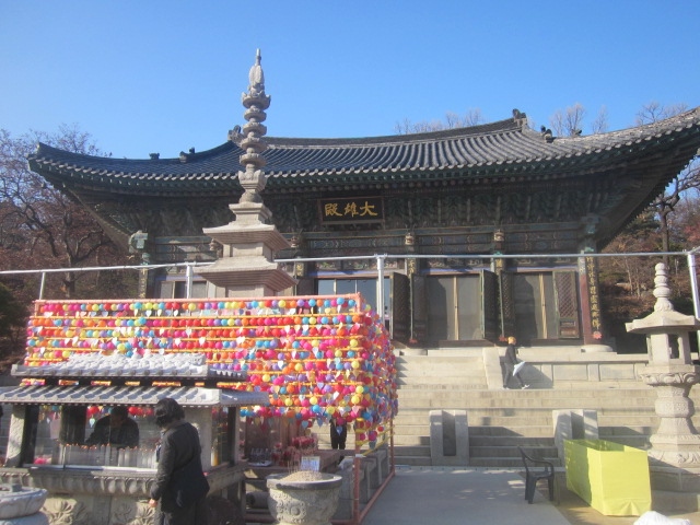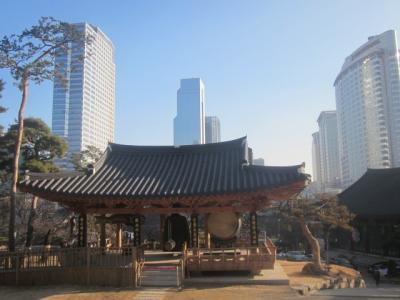 韓国仏教の曹溪宗に属するお寺で、その歴史は新羅時代の8世紀末に遡るとされる、創建1200余年を誇る韓国を代表する名刹の一つです。現在みられる建物の多くは20世紀以降の再建建築ですが、本堂に相当する大雄殿や、大きな弥勒大仏など境内も広々として見所が満載のお寺です。江南地区にあるお寺なので、高台に登ると、お寺の建造物の背後に江南のビル群が望めて、これがまたこの地区にあるお寺らしい風景を醸し出していて素敵でした。