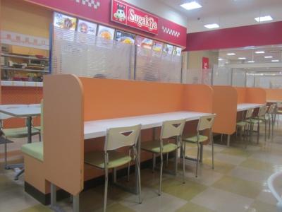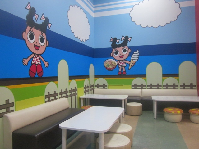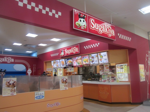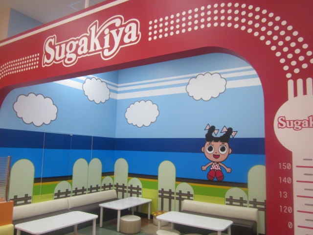 名古屋市の東部の住宅街にあるイオン内にある店舗で、近くに観光地があるような立地ではありませんので、観光客の方には縁遠い店舗かなと思いますが、この店舗は、客席の内装が素敵で、寿がきやのキャラクター、スーちゃんをあしらった客席部分が、テーブル・椅子が一段低い仕様になっていて、お子様向けに配慮されたレイアウトとなっています。また、このお子様向けブースの入り口部分には、スーちゃんと身長比較できるような目盛りが付いていて、ここもよく、お子さんが実際に身長を測って楽しむ光景を見かけます。