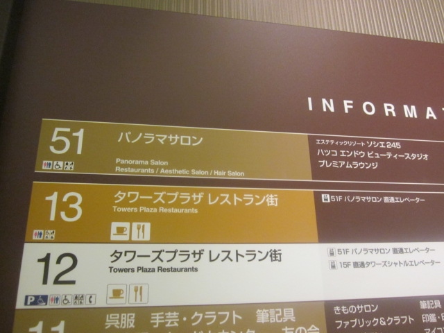最上階がレストランみたいになっていますが、敷居だけが高くて、基本的に登れるのはプライドも年収も高い富裕層の人だけ、と、庶民的な風情の方は、訪問を諦めた方が良いです。タカシマヤの上部に該当する51Fのパノラマサロンにしても然り。エレベーターで行くことは出来ますが、展望の開けた側は全て店舗内にあるので、各店舗を利用しないと眺めることすらできない(この階まで行くだけ、は可能)、という残念なレイアウトです。