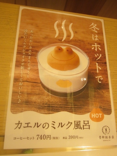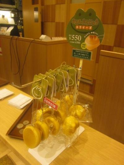 勿論、カエルまんじゅうを購入することも出来ますが、今回は数量限定でカエルまんじゅうをデザインしたスクイーズ(カエルまんじゅうと同サイズ、同型をしていて、一見すると間違って食べてしまいそう…( ´∀` )が販売されていたり、店内のショーケースにはケロケロ楽団(?)がディスプレイされていたり(こっちは非売品らしい…)、イートインブースがあって、そのメニューの中には、飲み物をオーダーするとカエルまんじゅう(ミニカエルサブレ付き)がセットでついてきたり、そもそもカエルまんじゅうを使ったオリジナルのケロケロメニューが提供されていたり、と、とにかくカエル好きな方には萌えることが満載の素晴らしいお店ですので、是非訪問してみて下さい。