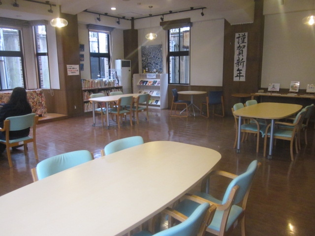 元々は四日市市の図書館だった建物だったそうですが、今は、地元の方向けのコミュニティーセンターのような運用をされていて、1F部分はだれでも利用できるパブリックスペースとして開放されています。ちょっとした図書コーナーもあって、館内で本を読んで時間を潰したりもできます。(私は鉄道好きなので、ここに置かれていた近鉄関連の蔵書に目を奪われてしまいました。)