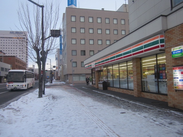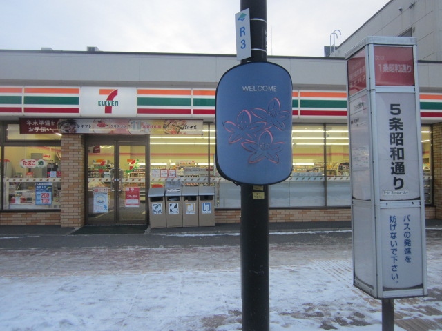 このセブンイレブン店舗は、丁度目の前に5条昭和通りの旭川電気軌道バス停留所があり、この停留所から旭川空港行のバスに乗ることが出来ますので、車内食調達にもお勧めできる店舗です。