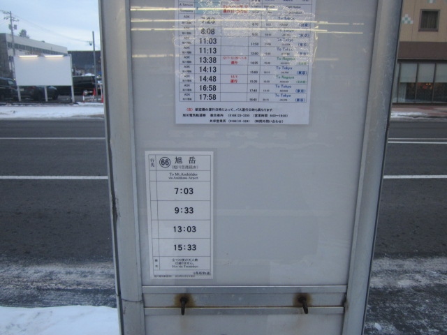 空港行バスは77番系統ですが、他に旭岳に向かう通称いで湯号(66番系統)もこのバス停発着で、空港も経由しますので、同じように空港アクセスに使用できますが、こちらは終点が空港でなく、寝過ごすと旭岳まで行ってしまいますので御注意下さい。- 旅行時期