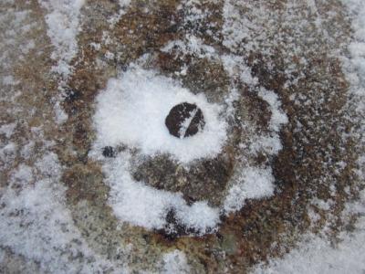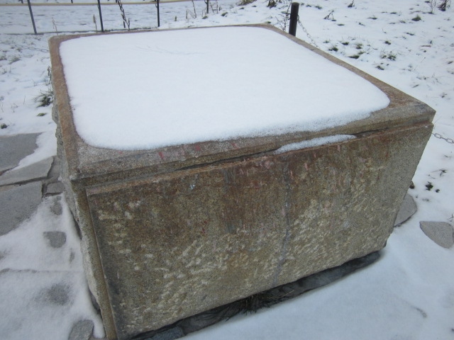 私の訪問時は、この沓座石の上に軽く雪が積もっていたので、それを掃ってみると、繋ぎ目に固定されていたというセットアンカーの切断跡も、きちんと確認することが出来ました。